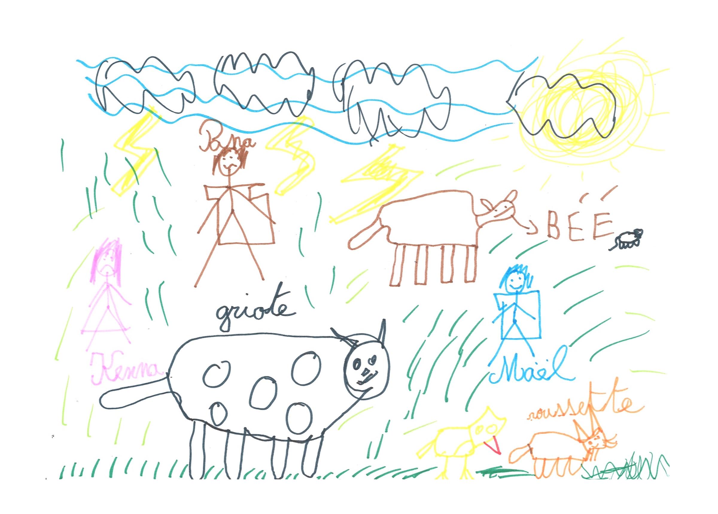 Je n’aime pas trop les vaches parce qu’elles font des grosses crottes, mais papa dit que c’est un bon engrais pour le jardin. Si je pouvais avoir d’autres animaux, j’aimerais beaucoup avoir un âne, ça me fait rire quand ils font Hi han. Et puis aussi une girafe, juste pour la regarder car c’est joli une girafe et pour la caresser, mais je sais que ce n’est pas facile d’en avoir une.
