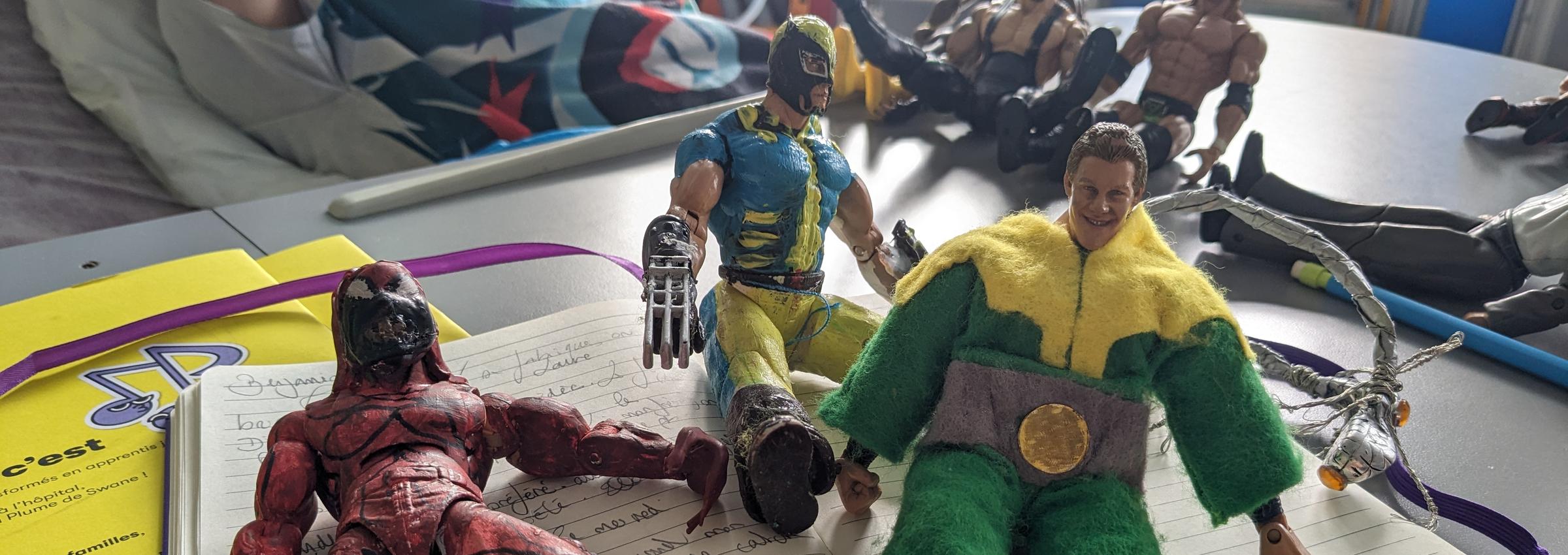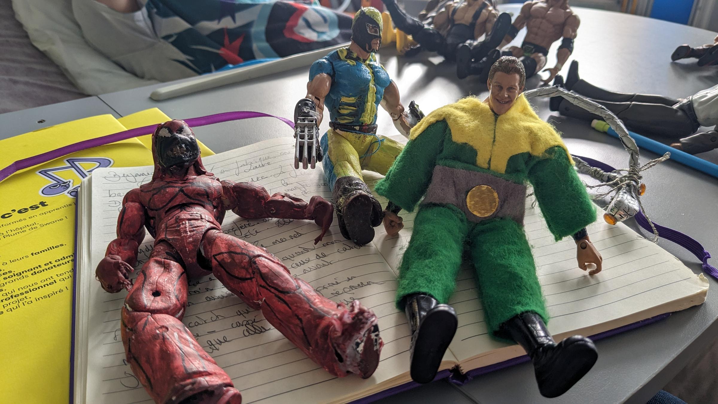 Avec Laure, mon amie de dialyse du mercredi, on s’amuse à transformer les figurines de catcheurs. On les peint, on les transforme… elle leur fait même des vêtements. Ce n’est pas toujours facile de trouver des idées ! La prochaine fois, il faudra que je lui demande de recoller les griffes de l’un d’entre eux qu’on a transformé en Wolverine !